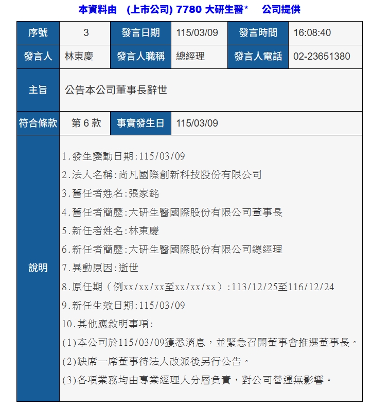 大研生醫(7780)董事長張家銘睡夢中辭世,享年47歲,大研生醫發布重訊證實。據了解,張家銘在海外出差期間,在睡夢中辭世。公司表示,為維持營運穩定,緊急召開董事會推選董事長,決議由總經理林東慶接任董事長職務。