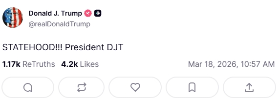 委內瑞拉擊敗美國奪冠那一刻,川普秒在真實社群(Truth Social)發文表示,「建州啦!」讓人不禁聯想他在美委之戰開打前,喊話委內瑞拉「要不要成為第51州?」的言論。