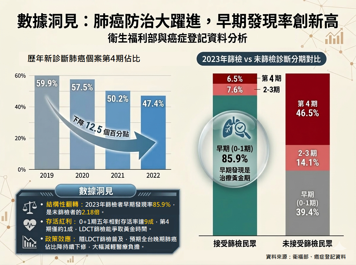 隨著低劑量電腦斷層(LDCT)篩檢推動,早期診斷比例大幅提升,晚期比例逐步下降,顯示透過篩檢將肺癌發現期別「往前抓」,已成降低死亡率的關鍵策略。