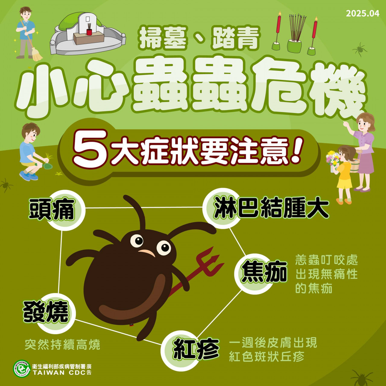 兒童連假、清明連假將至,今年連假放4天,疾病管制署(疾管署)提醒民眾,若在連假期間規劃前往掃墓祭祖,或是計畫至郊外踏青、登山露營等活動,務必留意易釀恙蟲孳生的草叢環境,並做好個人防護措施。