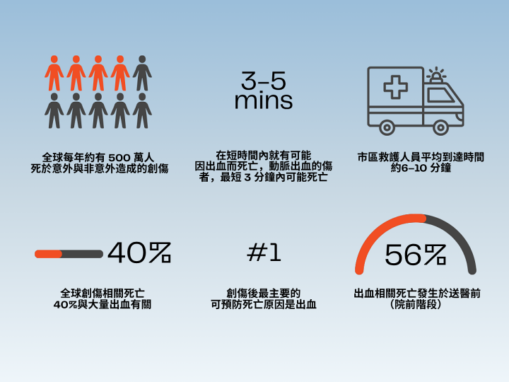 然而,現行大眾對於急救的理解,多停留在撥打119或進行CPR等基礎認知。當真正面對出血不止的情況時,多數人仍缺乏相對應的知識與工具,使「黃金救援時間」難以被有效掌握。