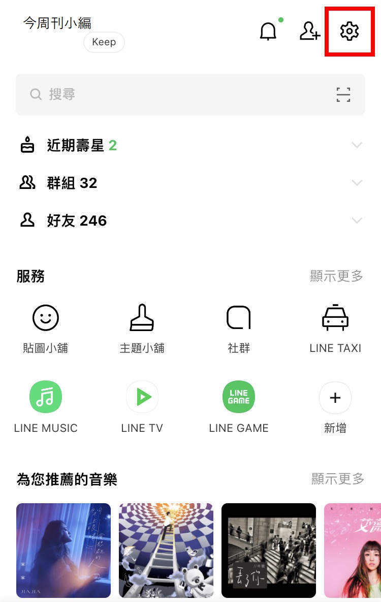 首先點開LINE介面,至「主頁」之後,點選右上角的設定「圖案」。(下圖紅框處)