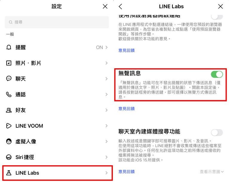 滑至點選一般項目中的「Line Labs」,再將「無聲訊息」的功能開啟!