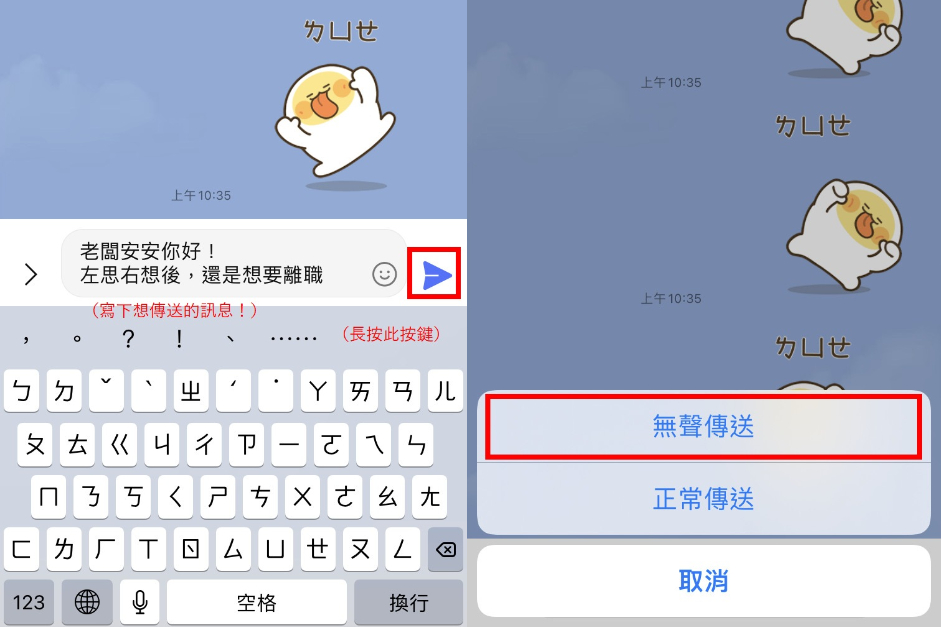 LINE還真有這項「貼心」的功能,就能「無聲傳送」訊息給對方,猶如對方將你的來訊「提醒關閉」一樣。