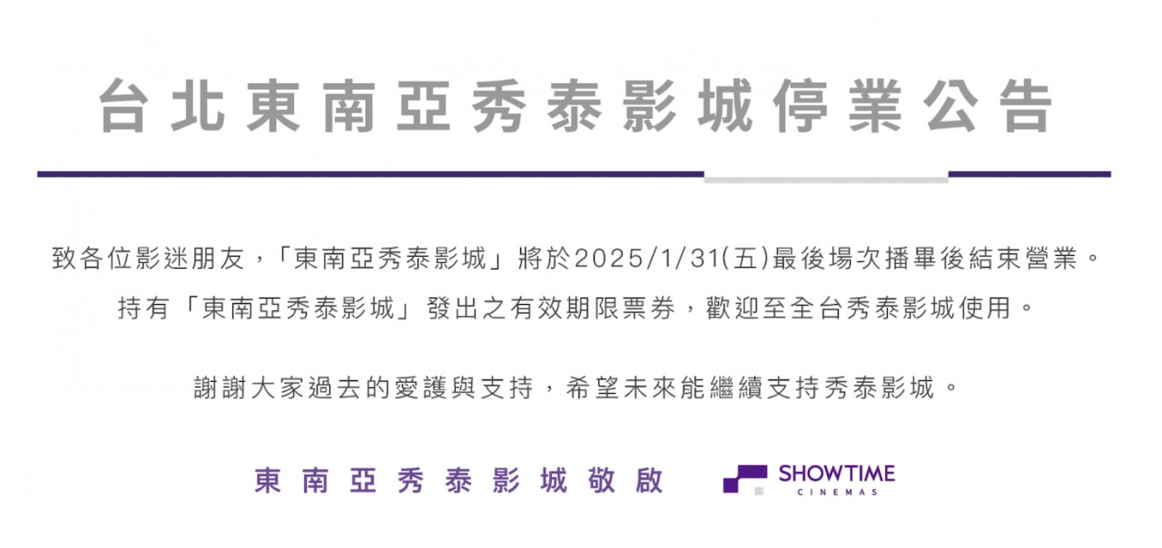 直到日前,秀泰影城在官網公告,「東南亞秀泰影城」將在2025年1月31日最後場次播畢後結束營業,並提醒持有「東南亞秀泰影城」發出的有效期限票券消費者,也能到全台各地秀泰影城繼續使用。