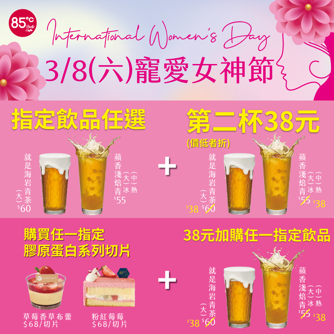 85度C舉辦「38寵愛女神節」,3/8當天推出兩大超值優惠!當天購買「粉紅莓莓」、「草莓香草布蕾」兩款膠原蛋白切片蛋糕任一片,就能以38元加購一杯「就是海岩青茶」或「蘋香淺焙青」。此外,當天選購「就是海岩青茶」大杯,或「蘋香淺焙青」(中熱/大冰),任選第2杯只要38元,以價低者折扣。