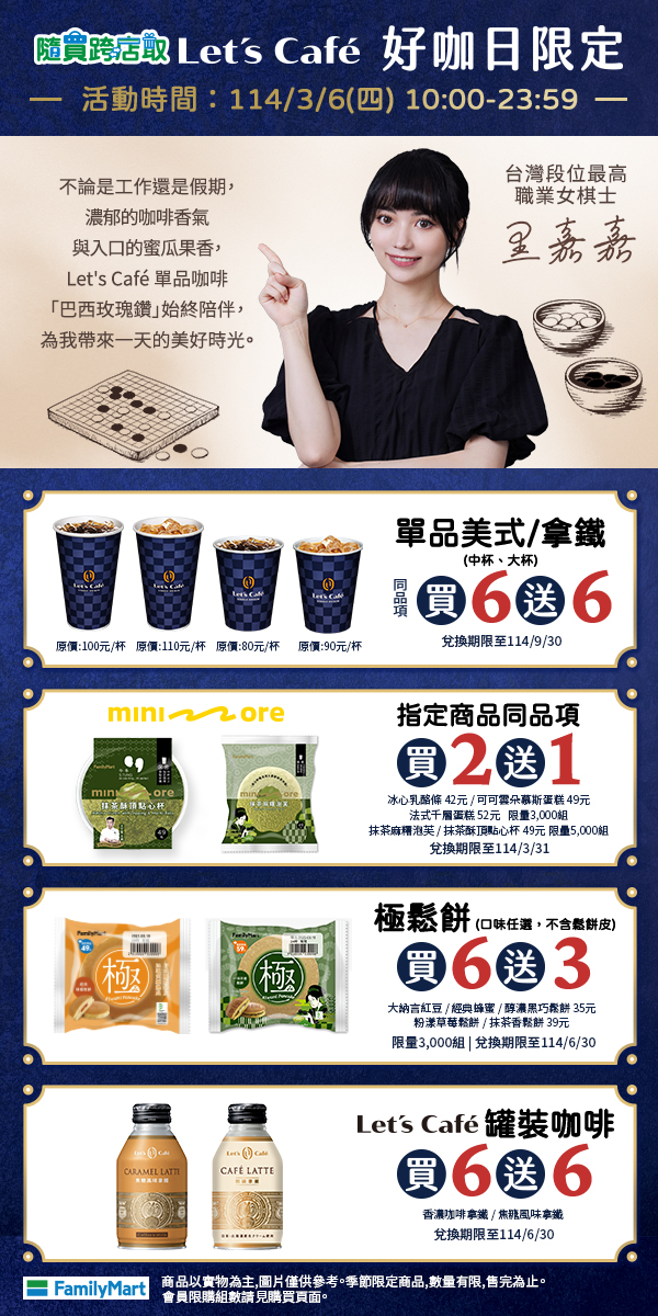而7-11則自3/5至3/18,門市購買特大杯濃萃拿鐵、濃萃美式、厚乳拿鐵,任選2杯只要99元。全家寄杯優惠3/6上午10點開賣,中杯單品美式、單品拿鐵、大杯單品美式、單品拿鐵買6送6。85度C舉辦「38寵愛女神節」,3/8當天將推出兩大超值優惠。
