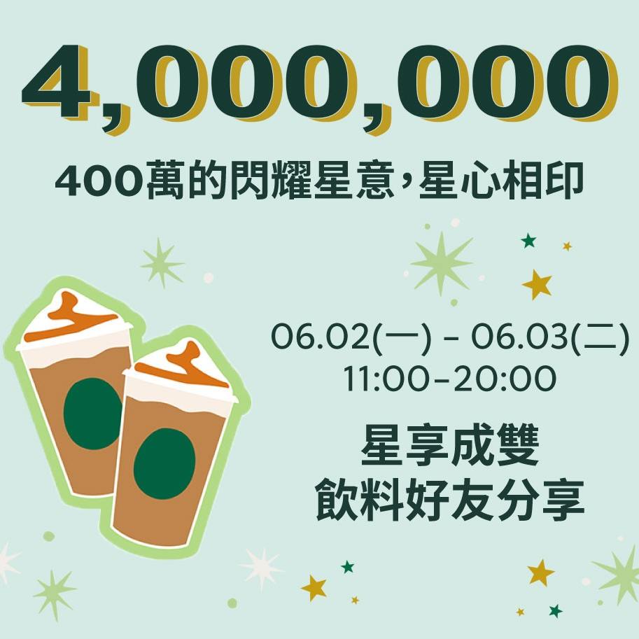 星巴克買一送一又來了,這次推出「歡慶400萬會員回店 星享成雙 好友分享」活動,於6/2至6/3,星禮程會員至門市購買兩杯大杯(含)以上容量/冰熱/口味皆一致的飲料,其中一杯由星巴克招待。