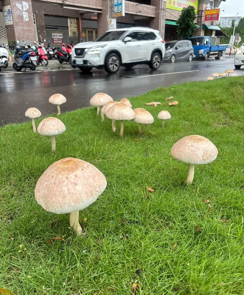 Instagram粉絲團「高雄美食地圖」分享照片,高雄一處道路中央分隔島上長滿大型蕈菇,數量超過20個,不少人留言表示「有點可愛,可以吃嗎」、「今天晚餐有著落了」、「太大朵了啦,笑瘋」。