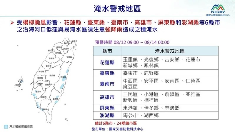 國家災害防救科技中心表示,花蓮縣、台東縣、台南市、高雄市、屏東縣和澎湖縣等6縣市,沿海河口低窪與易淹水區須注意強降雨造成的積淹水。
