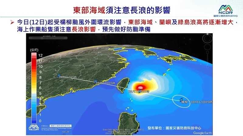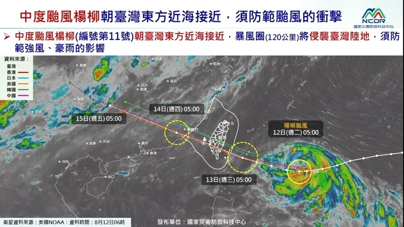 國家災害防救科技中心表示,周三(8/13)將威脅台灣,楊柳影響台灣陸地時間為周三至周四(8/14),暴風圈主要強降雨區為東半部、南部及中南部山區,強陣風影響範圍為花東、中南部地區、離島及沿海空曠地區。
