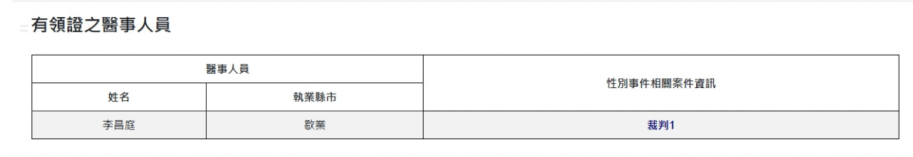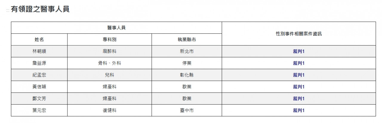 衛福部「醫事人員性別事件資訊專區」:https://ma.mohw.gov.tw/Accessibility/VIOSearch/MASearchVIO