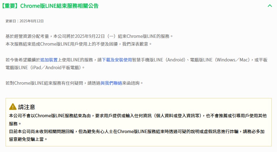 台灣人最常使用的通訊軟體LINE日前發布公告,「基於經營資源分配考量,將於2025年9月22日結束Chrome版LINE的服務。」提醒用戶若有使用上的需求,可以改安裝電腦版的LINE或是以智慧型手機、平板電腦登入使用。