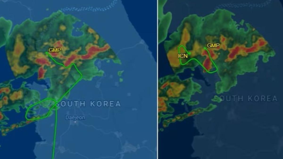 ▲航班在南韓上空盤旋一陣子後降落在金浦機場(左圖),近3小時後從金浦起飛並降落在原目的地仁川機場。(圖/翻攝自 FlightAware)