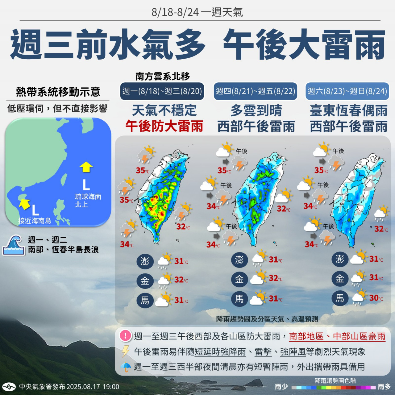 8/19(二)~8/24(日)氣溫預測:北部25~35度,中南部24~34度,東半部25~32度;澎湖26~31度,金門26~32度,馬祖26~31度。