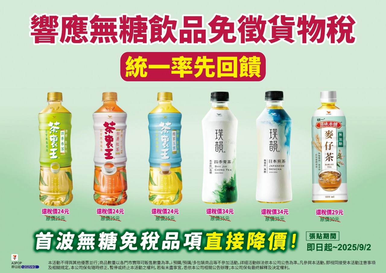 統一表示,自家致力於無糖與低糖飲品的研發創新,,旗下「茶裏王無糖茶系列」、「統一陽光無加糖系列」等產品均獲市場高度肯定。此次免稅政策順利通過,對於政府現在有徵貨物稅的無糖茶品項,企業第一時間啟動內部相關產品降價計劃。
