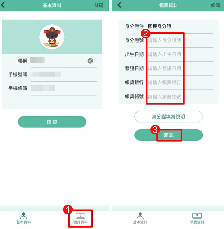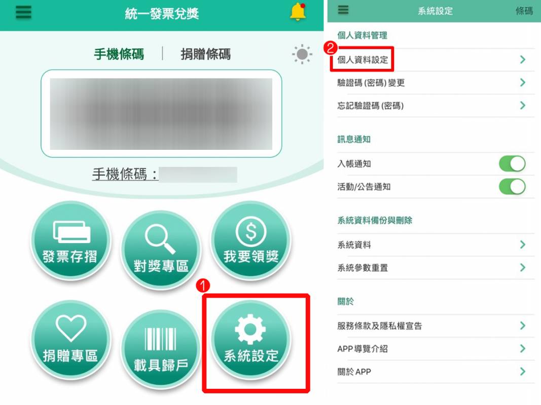 步驟:打開財政部【統一發票兌獎APP】 → 點選【系統設定】 → 點選【個人資料設定】 → 點選【領獎設定】,填入身分證字號、領獎銀行、領獎帳號等資料... → 確認