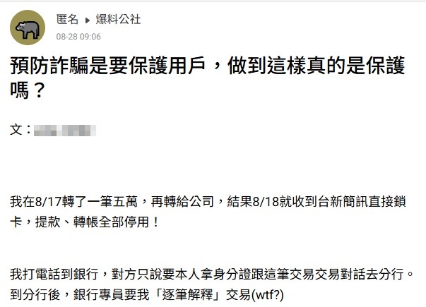 原PO攜帶身分證、交易紀錄至銀行臨櫃欲「解凍帳戶」,銀行專員要原PO「逐筆解釋」交易紀錄並附上證明,令她質疑「朋友請她帶買東西再進行轉帳,要怎麼提出證明?」並反問行員:「你去存錢的收據都會留著嗎?」讓原PO直呼「預防詐騙是要保護用戶,做到這樣真的是保護嗎?」