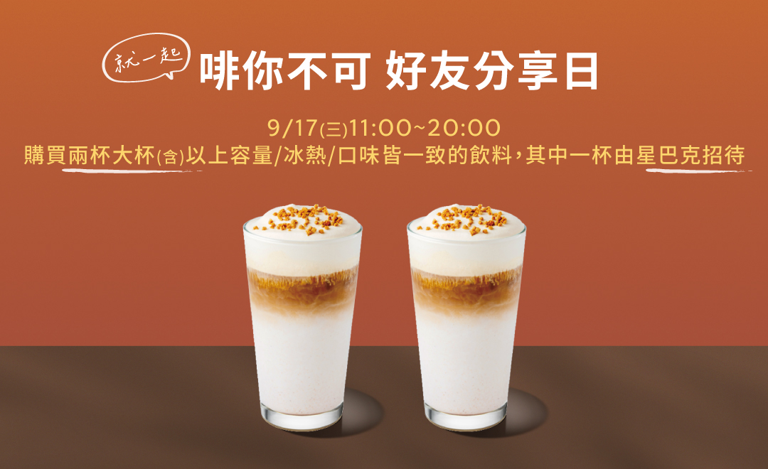 本周星巴克買一送一活動又來了!根據星巴克官網,在9/17(星期三)推出「啡你不可 好友分享日」活動,於活動期間11時至20時,購買兩杯大杯(含)以上容量/冰熱/口味皆一致的飲料,其中一杯由星巴克招待。
