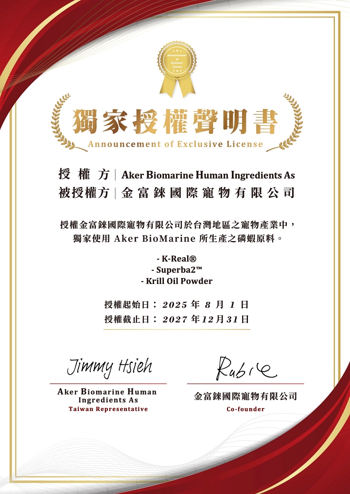 看準這波毛孩營養升級的趨勢,全球磷蝦油領導品牌 Aker Biomarine,攜手台灣唯一總代理宸品有限公司,並正式授權在地寵物保健品牌 「肉球世界」,成為台灣寵物市場唯一擁有南極磷蝦油使用的品牌。三方攜手,結盟打造磷蝦油獨家聯盟,為寵物毛孩帶來來自南極純淨海域的機能新能量。