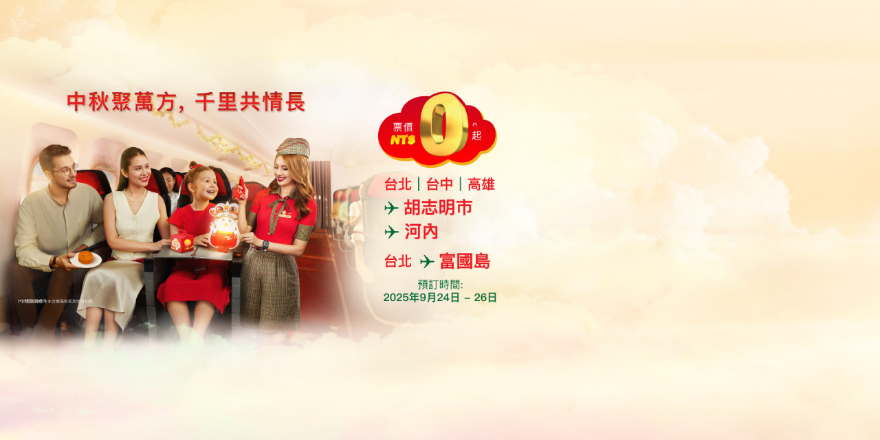 - 促銷航線:台北、台中、高雄出發航線;直飛 河內、胡志明市、富國島