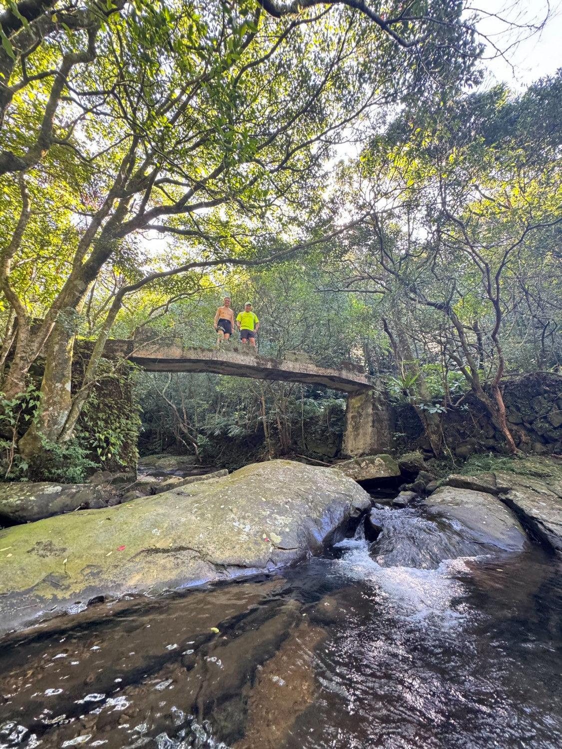 芊蓁坑的溪畔古道頗有桶後林道的味道,我們來到一座非常古老的石頭橋,橋下水面清澈,像是一面鏡子,這個幽靜溪谷,頓時讓人有悠悠歲月靜好,內心也跟著清澈透明的感覺,駐足在這裡,很想多待片刻。卸下所長職務的周會,感受更深刻,他很慶幸沒有錯過今天的爬山。