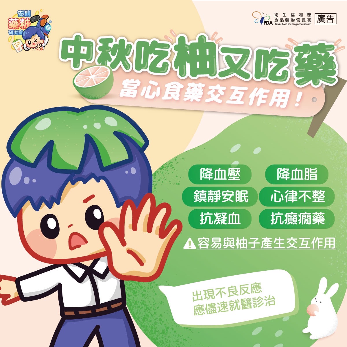 食藥署提醒,柚子、葡萄柚與某些藥物併用,可能增加藥物不良反應(風險)發生之機率,若有服用以下藥物者,應避免食用柚子:
