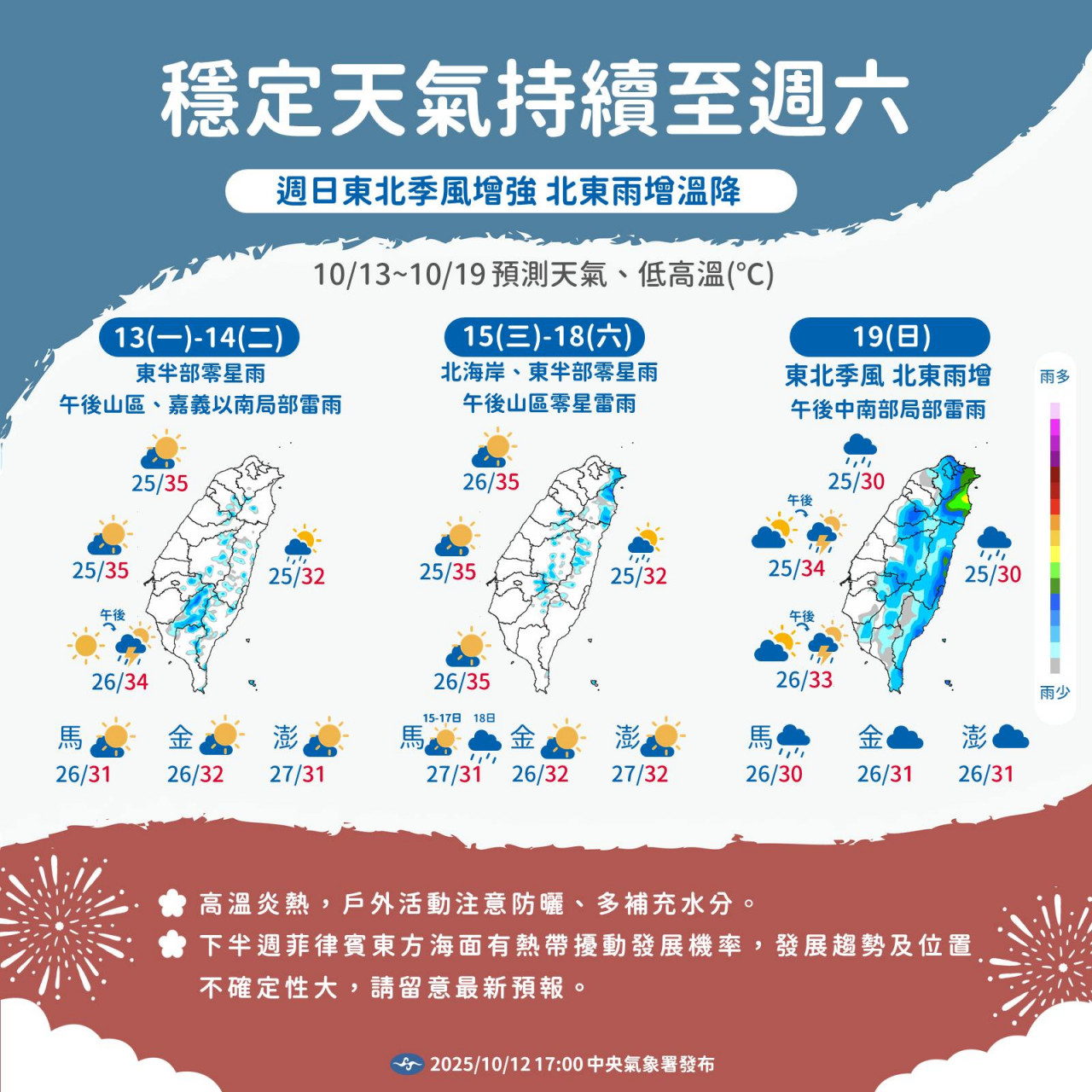 東北季風增強及熱帶性低氣壓或颱風外圍環流影響,10/19北部及東北部氣溫稍下降,10/20北部及東北部天氣稍涼,其他地區早晚亦稍涼;天氣方面,10/19及10/20迎風面雨勢明顯且範圍較大,桃園以北及東半部地區及恆春半島有短暫陣雨,北部地區亦有局部短暫陣雨,其他地區為多雲,午後有局部短暫雷陣雨;10/20中南部地區亦有局部短暫陣雨。