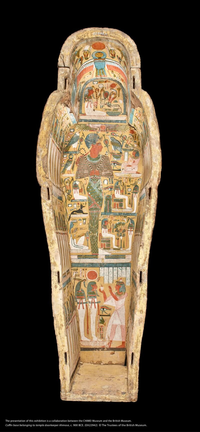 即使在死後,人們仍渴望獲得神化法老的庇佑。這位棺柩主人在棺底繪上法老的形象,象徵自己與神格化君王之間的靈性連結。