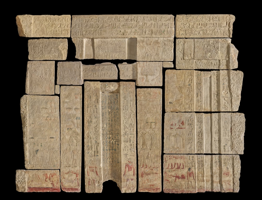 約西元前2494至2345年。高約2.5公尺、寬逾3公尺的祭堂牆面,刻畫祭祀場景與豐盛供品,是研究古埃及死後世界想像的重要依據。
