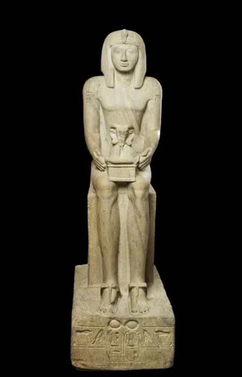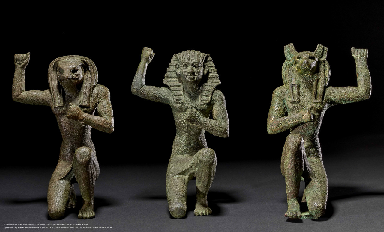 約西元前664至332年。這三尊塑像被認為是裝飾在運載神像的聖船上,象徵於法老加冕與慶典時守護君王的神聖力量。