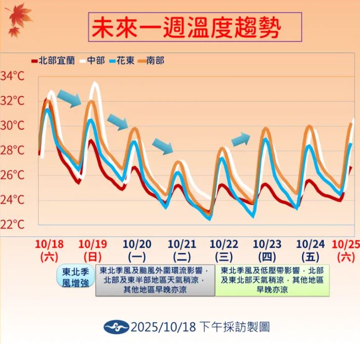 10/23(四)、10/24(五)東北季風影響,中部以北及東北部天氣稍涼,水氣偏多,基隆北海岸、東北部地區及新竹以北山區有陣雨,並有局部大雨或豪雨發生的機率,桃園以北及東部地區有短暫陣雨,並有局部大雨發生的機率,竹苗、東南部地區及中南部山區有局部短暫陣雨,其他地區為多雲。