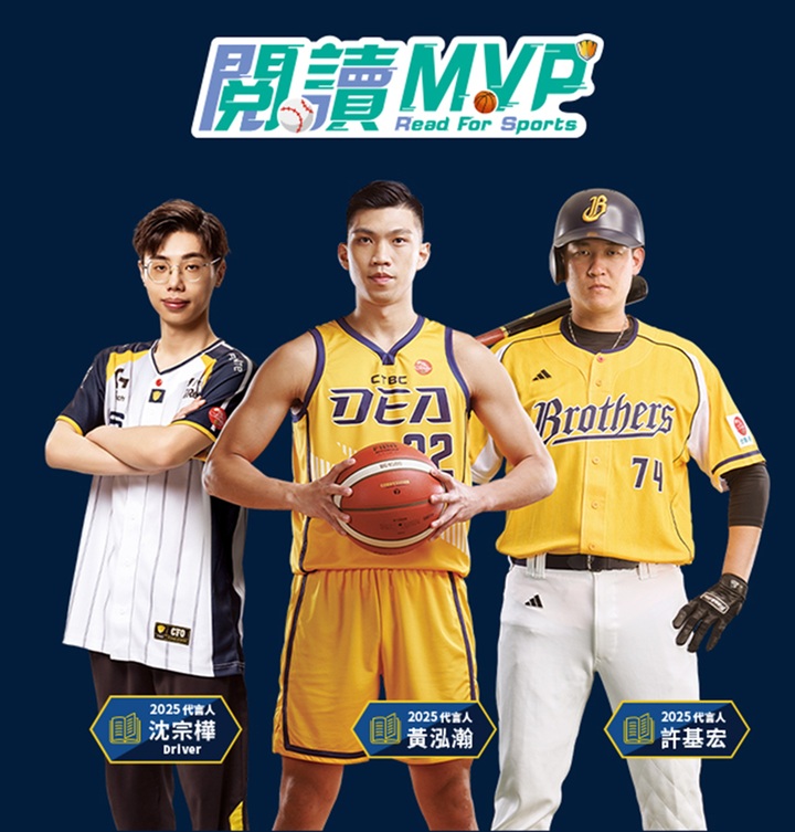 「2025閱讀MVP」由中信兄弟許基宏(右)、中信特攻黃泓瀚(中)及中信飛牡蠣沈宗樺(Driver)(右)共同代言。/中信銀行提供