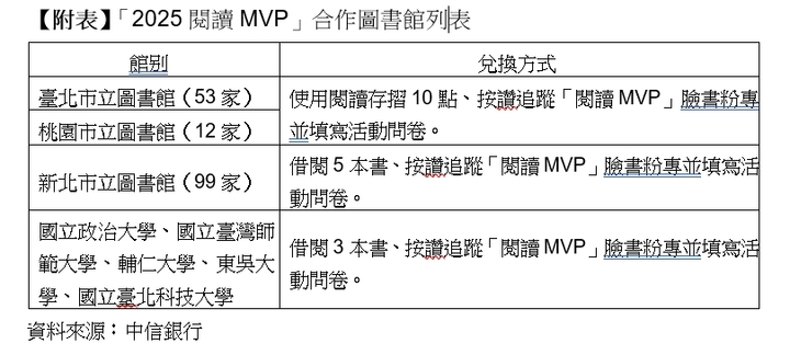 中國信託商業銀行(簡稱「中信銀行」)主辦結合閱讀及運動的公益活動「2025閱讀MVP」本(10)月22日正式起跑,攜手臺北市、新北市、桃園市共164家市立圖書館及5所大學,合作推出借書換票活動,總計提供6,000張新北中信特攻籃球隊(簡稱「中信特攻」)2025-2026球季例行賽主場門票兌換券。