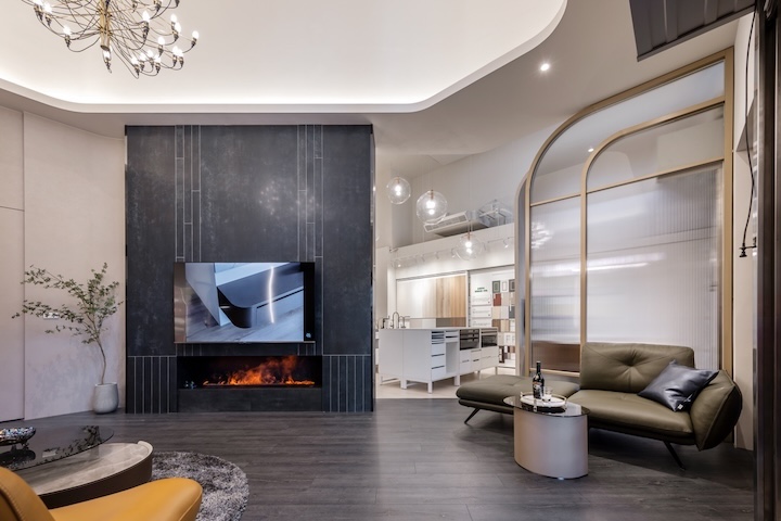 走進挑高超過6米的門廳,立刻感受空間賦予的都會時尚感,上方的枝狀吊燈在深黑灰色的挑高電視牆面前顯得格外吸睛,大理石紋牆面下壁爐仿火焰冒出微微氤靄水氣,深色的木質地板,頂級的牛皮沙發,點出空間在追求奢華又帶給人放鬆氛圍。另一角落的長虹玻璃隔間的圓弧金色紋飾,帶點古典奢華氣氛,又功能性的區隔了不同空間。宛如精品酒店的奢華門廳,是綠的傢俱全新開幕的板橋門店。