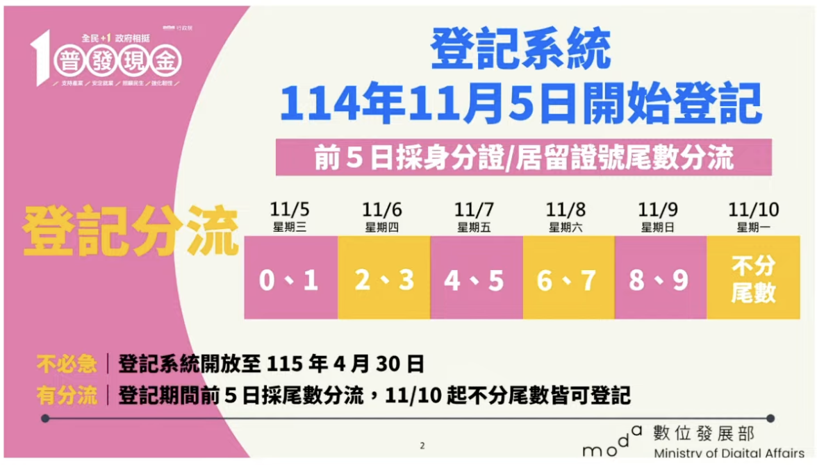 數發部指出,民眾不用出門,連上網就可以登記,省時又省力。前五天採分流作業,身分證尾數來進行分流,若這五天來不及登記,11月10日後不分身分證字號尾數,所有人都可以登記,系統開放至2026年4月30日。