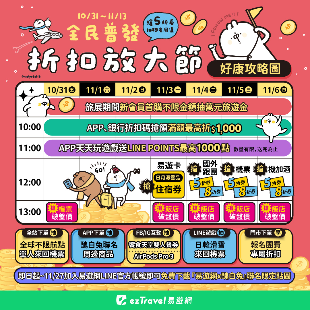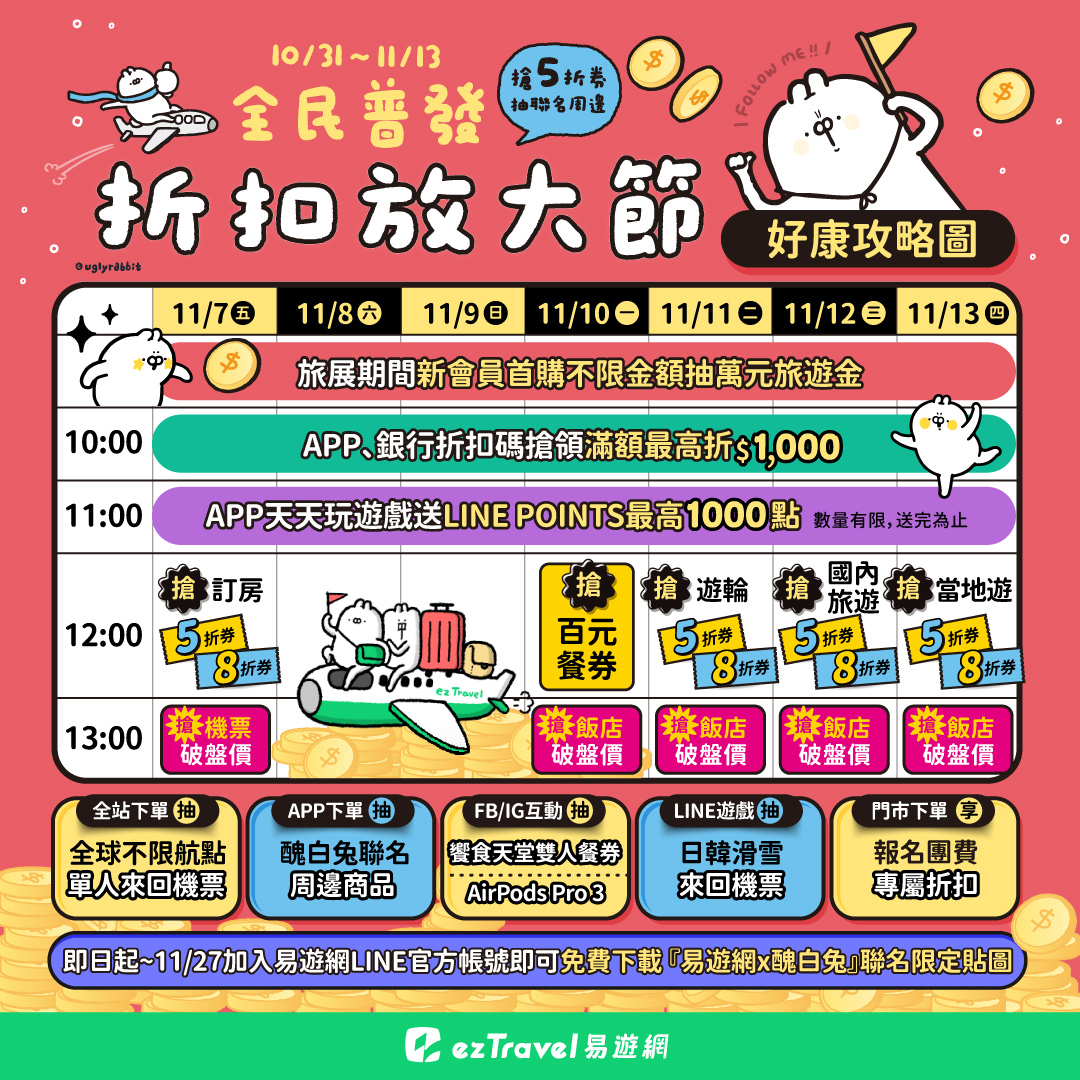 配合普發一萬政策及ITF旅展,易遊網於即日起至11月13日推出「折扣放大節」,不僅可以搶限量全站、銀行折扣碼,還有住宿、機票、機加酒的五折及八折券限量開搶,國內國外通通有,真的把普發10000元用得淋漓盡致,物超所值!詳情請依官網公告為主。