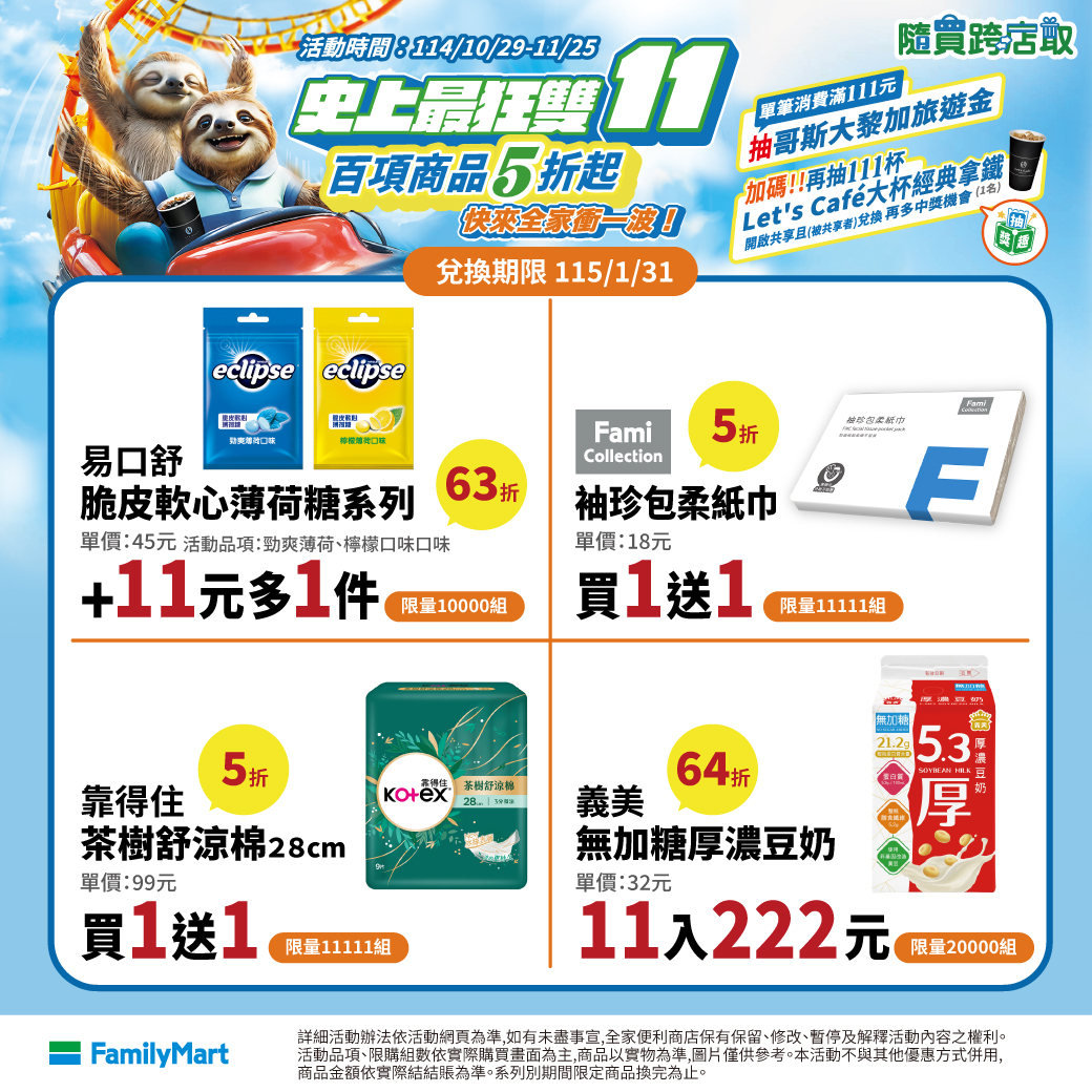 即日起至11/11,指定商品「買1送1起」,零食、飲料、咖啡通通有。