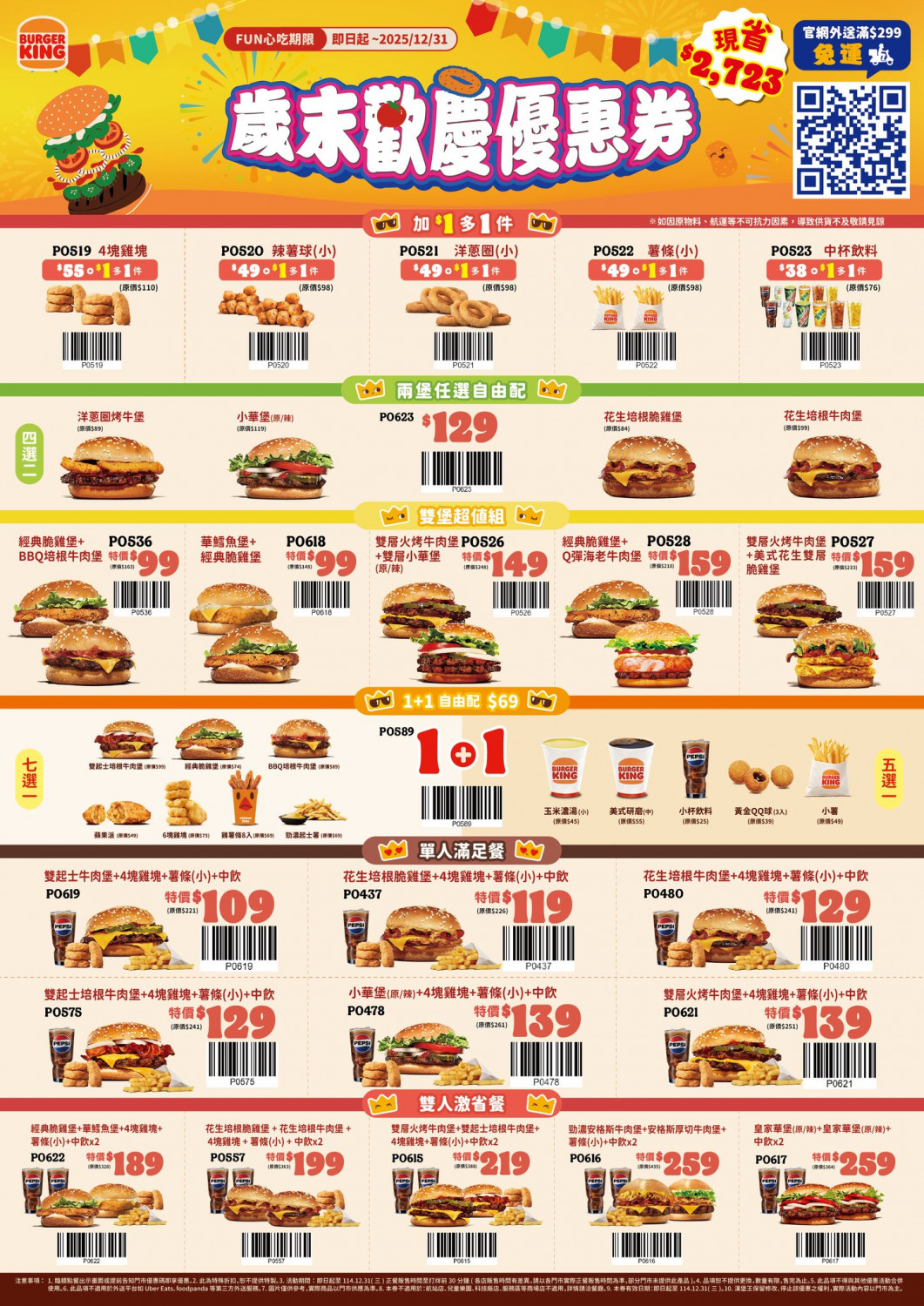 即日起至12/31祭出「歲末歡慶優惠券」,「經典脆雞堡+BBQ培根牛肉堡」、「華鱈魚堡+脆雞堡」99元起;「1+1自由配」69元;4塊雞塊、薯條、薯球等「加1元多一件」;「單人滿足餐」4件組最低49折、109元起;「雙人激省餐」組合189元起。整張優惠券「現省2723元」吃到年底。