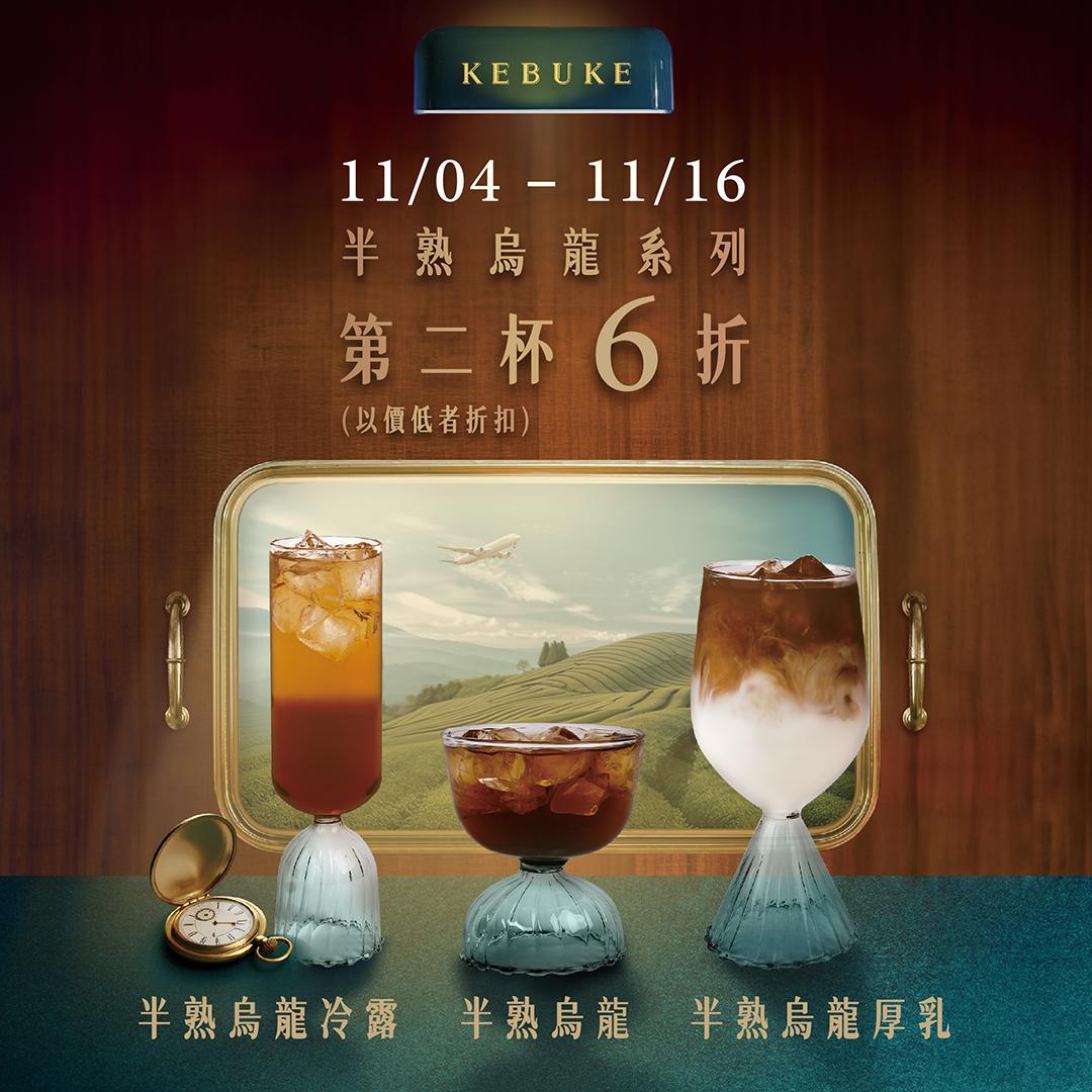 即日起至11/16,「半熟烏龍系列」限時第2杯6折優惠,品項有「半熟烏龍」、「半熟烏龍厚乳」、「半熟烏龍冷露」,活動只限大杯,無法加價加料,單品限折扣5組。