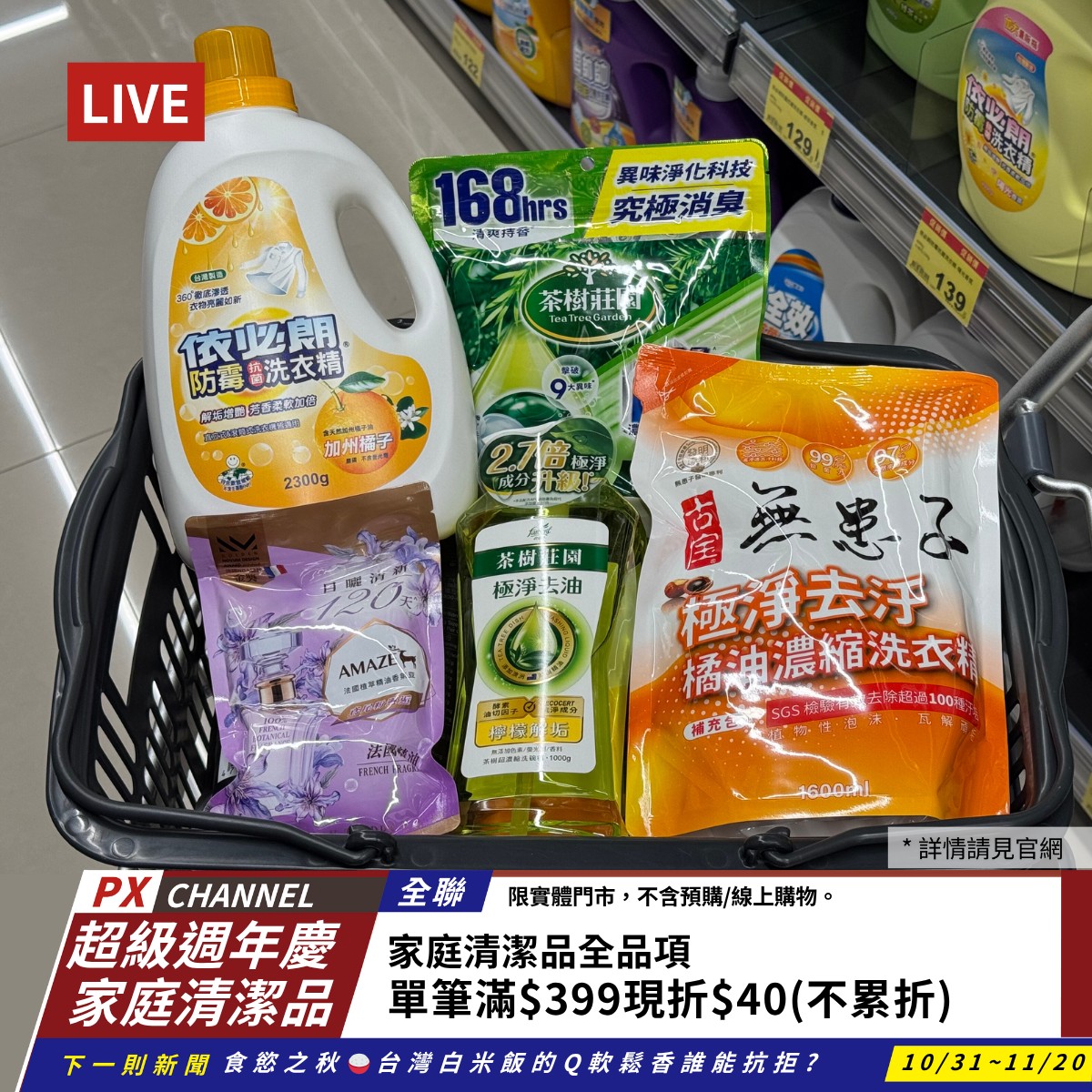 家庭清潔用品全品項單筆滿399元現折40。(圖/翻攝自全聯福利中心臉書)