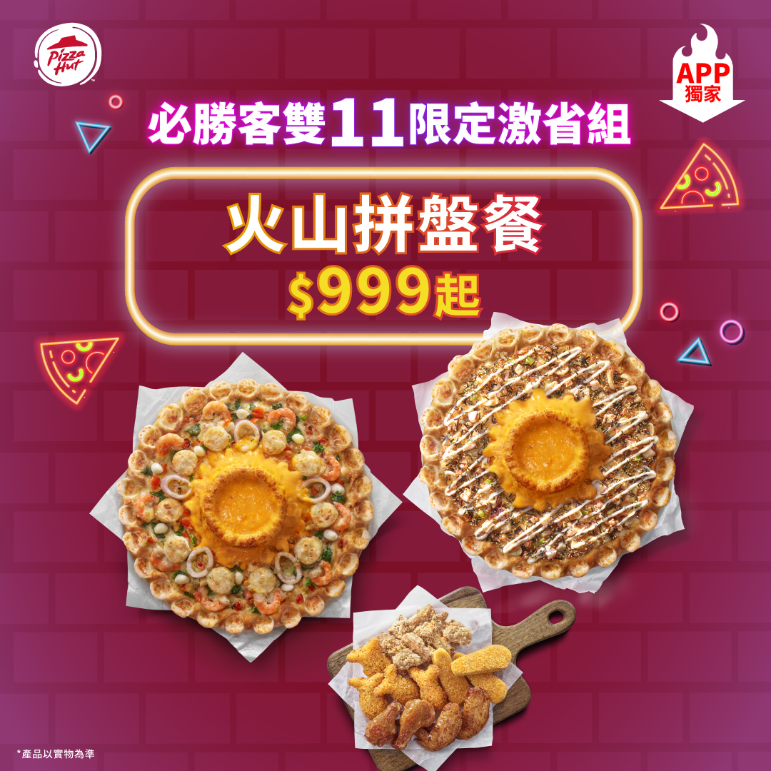 11/7、11/11及11/14上午10點,PK雙饗卡APP搶購11元「6吋鬆厚個人比薩」、111元「9吋鬆厚比薩」;多人餐有6折的1,311元「一公尺派對盒」與57折的999元「火山拼盤餐」。