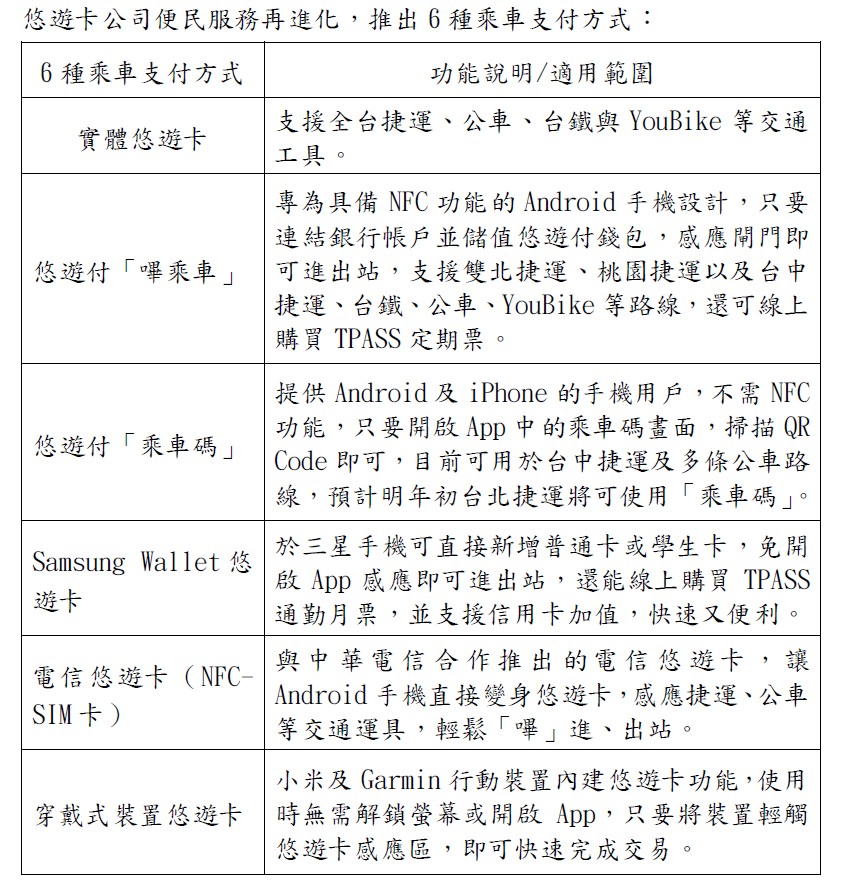 為提供民眾更多「嗶」進站的支付選擇,悠遊卡公司整理目前可用於捷運、公車等交通場域的 6 種方式。除了最熟悉的實體悠遊卡外,還包括: