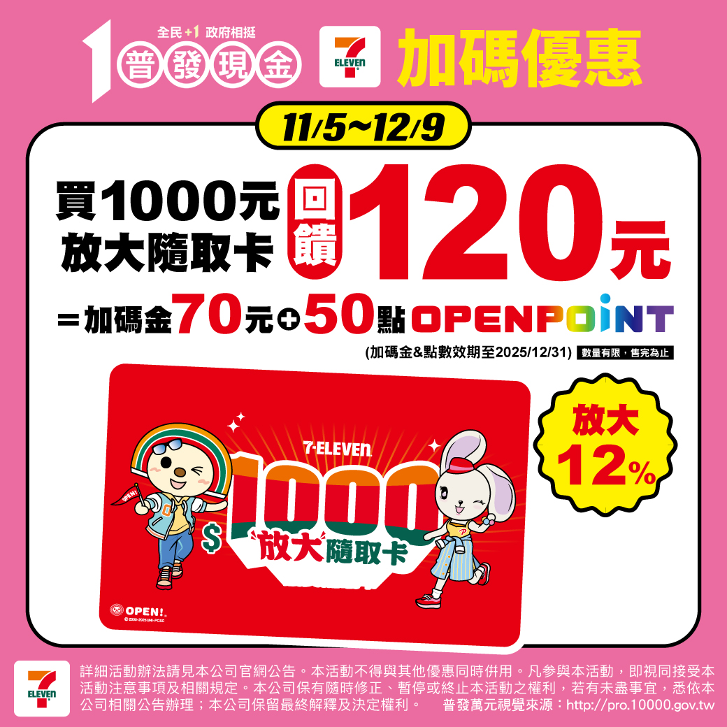 7-11同時推出「1000元放大隨取卡」,uniopen會員在活動期間購買7-ELEVEN「1000元放大隨取卡」,單張最高可消費至1070元,隨卡再加贈OPENPOINT點數50點。
