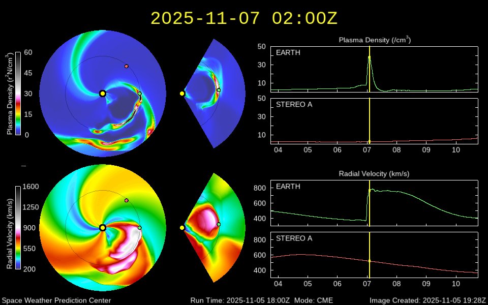 氣象署太空天氣作業辦公室進一步說明,受到太陽表面活躍區(AR4274)於周三(11/5)發生顯著的日冕物質拋射事件(CME),預期將於周五(11/7)清晨、台灣時間5:00通過近地太空環境,造成行星際空間中的太陽風風速及密度明顯增加。