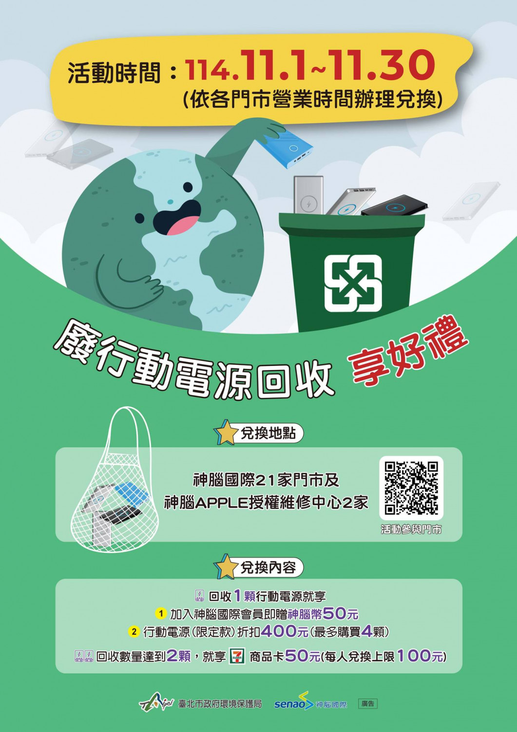 台北市政府環保局近期與神腦國際合作,推出行動電源回收換好禮活動,回收1顆可換400元折扣金,加入會員可獲得50元神腦幣,回收2顆廢行動電源還可以再獲得統一超商商品卡50元1張,守護環境安全,也能為地球貢獻一份心力。