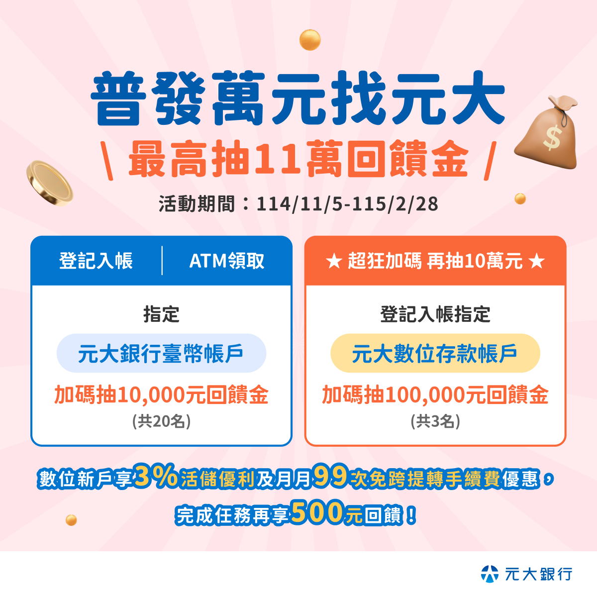 自11月5日至2026年2月28日,持元大金融卡於全台元大銀行ATM領取普發現金10000元,即可獲得10,000元回饋金抽獎機會。(與登記入帳選元大銀行臺幣存款帳戶共享限額20名)