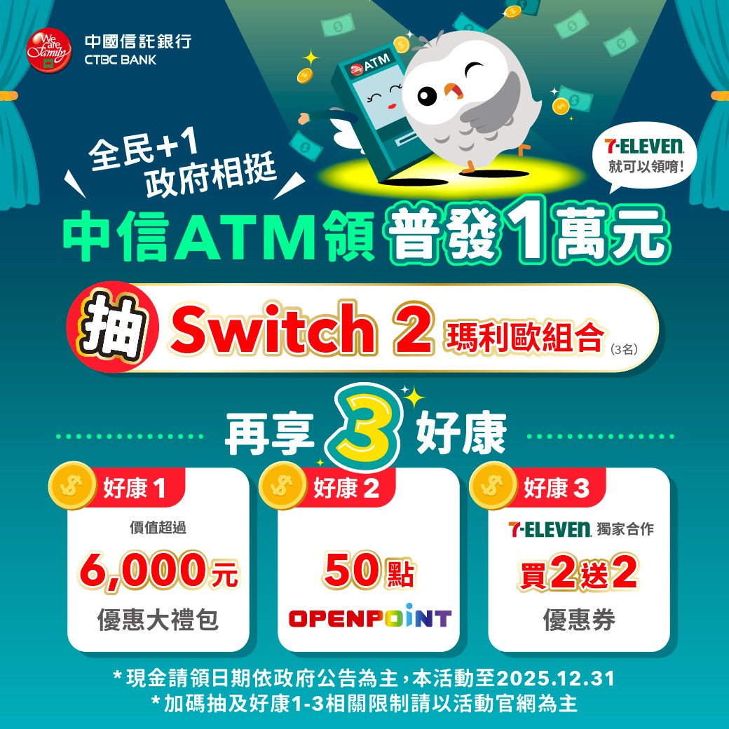 自11月17日至12月31日,不限中信金融卡於活動期間至中信銀行ATM成功領取普發一萬元現金,就可以抽「Switch2+瑪利歐賽車世界同捆組」,還享有3項好康:價值超過6,000元優惠大禮包、首次綁定中信LINE個人化服務,送50點OPENPOINT、7-ELEVEN獨家合作「買2送2」優惠券。