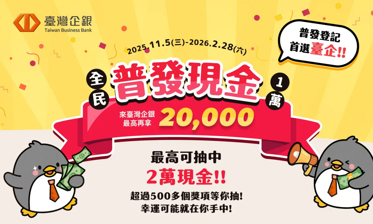 自11月5日至2026年2月28日,持臺灣企銀晶片金融卡至臺灣企銀ATM成功領取普發現金1萬元,每成功一筆即可獲得1次抽獎機會;若完成ATM領現且已申請Hokii數位會員之客戶,再加碼獲得1次抽獎機會,最高有機會抱走2萬元現金。