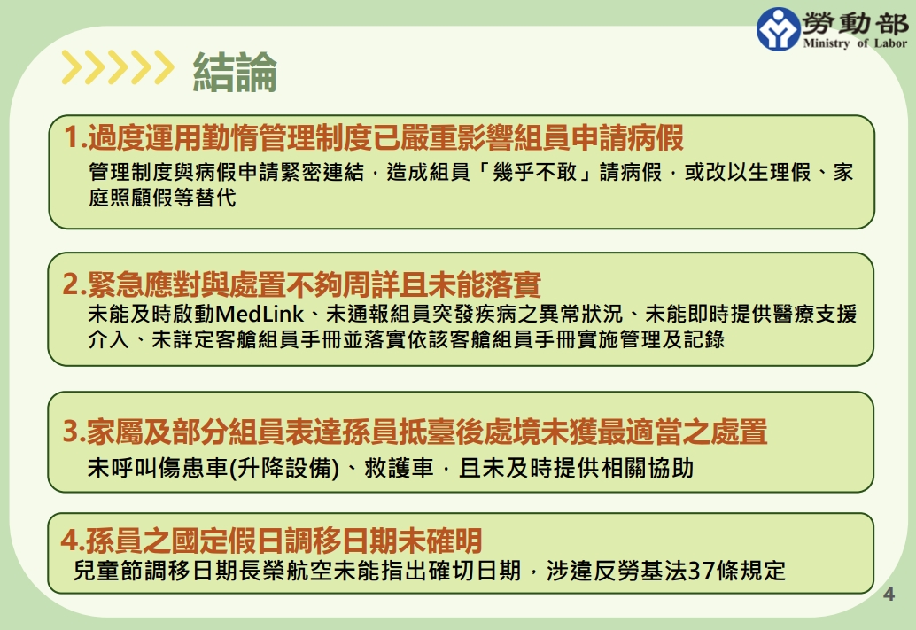 長榮航空指出,事件發生後已第一時間啟動調查,並以最快速度推動各項改善措施。對於勞動部調查報告所指制度仍有不周之處,公司將全力配合並加速完成檢討與修正。對於本次調查結論,長榮航空完整回應如下: